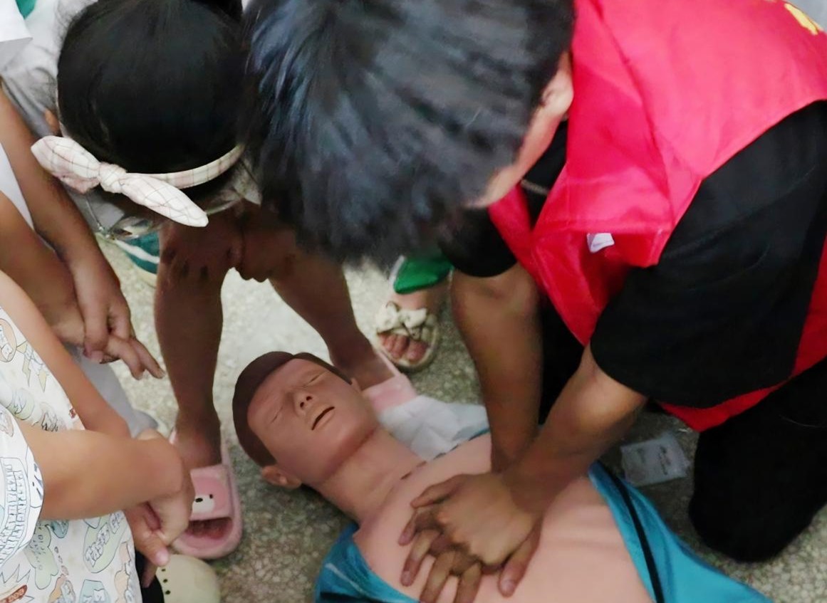 8 月 3 日,实践团成员在村委会活动中心举办了一场涵盖急救、防电诈等知识的宣讲活动。他们巧妙的借助仿真人偶,在现场深入浅出地讲解心肺复苏的知识与技能。在实践团成员的耐心指引下,学生们依次轮流上前模拟操作,亲身且完整地体验了心肺复苏的全过程。这种沉浸式的学习方式效果显著,不但让学生们牢固掌握了基本的急救技能,还让他们懂得在紧急状况下保持沉着冷静,能够迅速且有效地采取应对措施,从而为挽救生命争取到宝贵时间。与此同时,此次活动还极大提升了乡村居民的综合素养与自救互救能力,为构建和谐、稳定的乡村社会奠定了坚实基础。