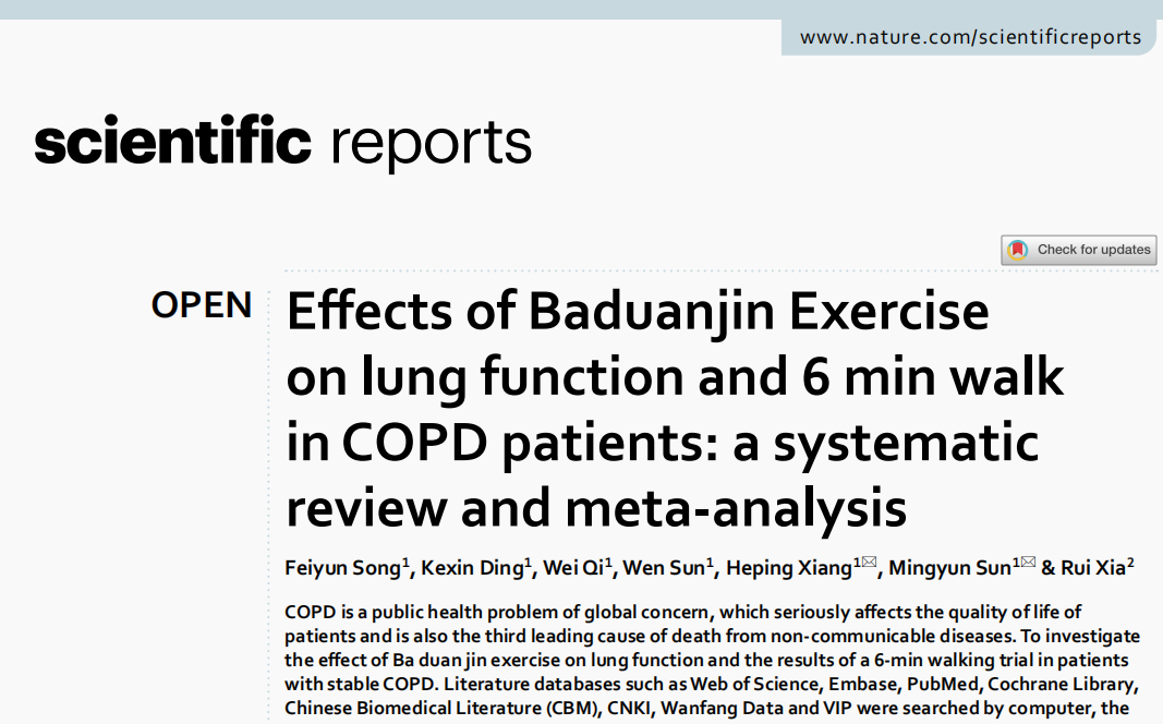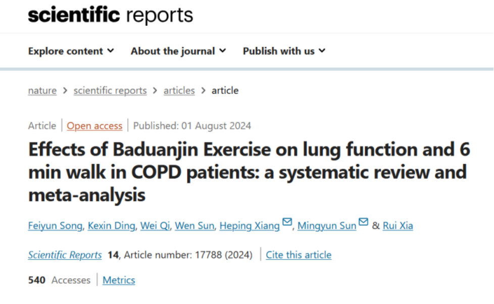 近日,米乐·M6(中国大陆)官方网站孙明运教授指导的宋飞云等研究生组成团队,在国际高水平期刊《Scientific Reports》(JCR一区/中科院二区期刊)发表了题为“Effects of Baduanjin Exercise on lung function and 6 min walk in COPD patients: a systematic review and meta-analysis”的论文,安庆师范大学为论文第一完成单位和通讯单位。《Scientific Reports》(IF=4.6)作为Nature 旗下的期刊,发表来自自然科学、心理学、医学和工程学等多个领域,致力于关注具有新颖性和示范性的原创研究。该刊作为全球第五大被引用期刊,所发表论文在学术界具有较高的认可度和影响力。