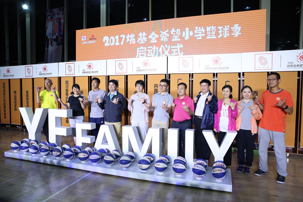5月22日晚 ,“2017姚基金希望小学篮球季”在北京NBA姚明篮球俱乐部正式启动。姚基金创始人姚明代表主办方为2017全国集训及联赛承办城市南京市授旗并与嘉宾合影。中国青少年发展基金会理事长王剑、副秘书长杨春雷以及爱心企业代表、高校代表、支教志愿者代表、项目受助乡村小学代表等共同出席了本次活动。
