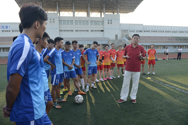 马良行教练首先和同学们做了简短的交流,紧接着观摩并指导足球训练营的课堂教学。在我校足球专业教师的指导下,足球训练营的男女队员分别进行了一对一攻防演练,展现了近期培训掌握的技能,赢得了马良行教练的赞许。之后,马教练进行了指导,特别指出一对一攻防演练中队员各自的空间距离感重要性。他同时要求同学们不仅要会做动作,还要知道为什么这么做;在训练比赛中,足球现场情况千变万化,一定要多思考,多问为什么,不能固守一种思路;更重要的是还要会教别人,尤其是作为未来的足球教师,要学会如何教授青少年足球爱好者技术动作等相关的足球文化,使我国现代足球文化遍及全社会,中国足球事业将会蒸蒸日上。