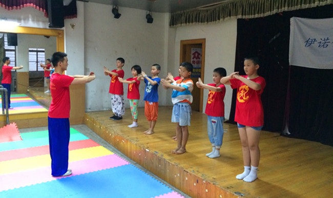 酷热三伏天,学员们仍然提前到达了活动地点,早早地就在垫子上做准备工作。教练性格也雷厉风行,上场后随即带领学员们进行热身锻炼。在课堂上,教练给学员们讲述武术的含义,制定武术兴趣班的课堂纪律,教授武术的基本动作。学员们的积极配合,教练们的悉心幽默的指导使整堂课在幽默轻松的气氛下进行。