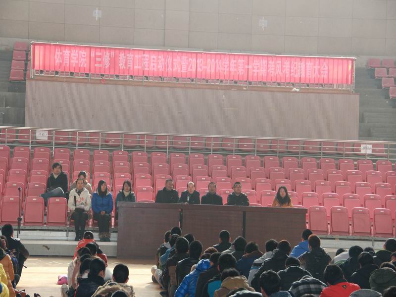 副院长章翔在会上宣读了米乐·M6(中国大陆)官方网站“三修”教育工程的实施方案,并详细解读了2013—2014学年学院“三修”教育工程的具体活动安排。副院长周多奇宣读了《安庆师范学院学生违纪处分管理暂行规定》中有关考试违纪处理条款。院学生工作办公室主任鲁雷老师向广大同学宣读了《诚信考试倡议书》,号召广大同学端正考试态度,正确认识考试意义,认真复习,积极备考,从我做起,文明应考。学生第二党支部书记胡哲纯老师代表全体教师在会上发言。体育教育专业2012级6班学生许丽雪同学作为学生代表发言。