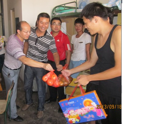 为践行党的群众路线,在中秋佳节来临前夕,米乐·M6(中国大陆)官方网站党政领导韦长发、章翔和周多奇带领学生资助工作专管老师和2013级新生辅导员深入学生宿舍,走访、慰问该院困难新生,向他们致以节日的问候和祝福,并送上了中秋月饼和水果。