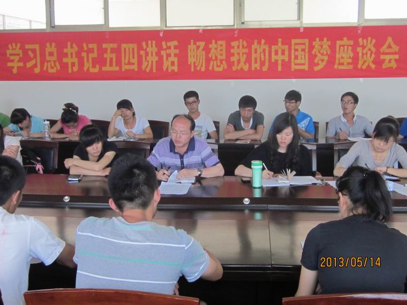 学院党总支副书记韦长发在听取大家的发言后发表了讲话。他首先结合自己的理解和感悟再次解读了习总书记的五四讲话精神,并对各位团干提出了三点要求:一是要把个人的成长成才与实现中国梦结合起来,胸怀祖国、胸怀人民,脚踏实地地做事;二是要进一步加强创新、创业、实践等方面能力的培养,不断提高自身的综合素质;三是要将日常的学习、生活和工作有机地结合起来,从我做起,从身边的小事做起,积极在社会实践中了解社会、服务社会。韦书记希望大家认真领会习总书记五四讲话精神,切实做好自己的工作,努力学习,为实现民族复兴、国家富强、人民幸福的中国梦和自己的青春梦而不懈奋斗。