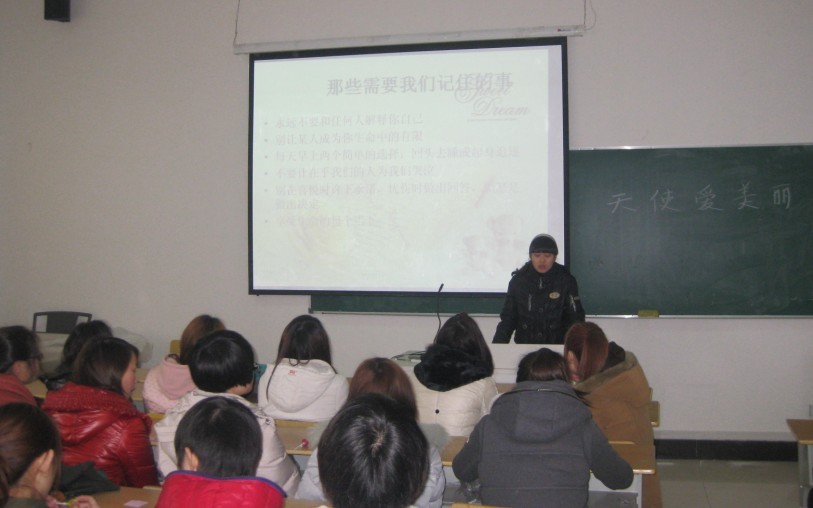 3月9号下午,以“天使爱美丽”为主题的女性知识讲座在体育馆多媒体教室举行。讲座吸引了来自我院不同年级不同专业的女生参加,此次讲座共涉及到美体、护肤、气质、修养等多方面的内容,使女生们在健康礼仪等知识方面获得很大收益。讲座最后,大家还在彩色的心愿纸上,写下了自己的节日愿望,并投入心愿盒当中,期待着自己的节日愿望能够实现。本次讲座为我院女生创造了一个很好的交流和学习的机会,得到了我院广大女生的喜爱和好评。