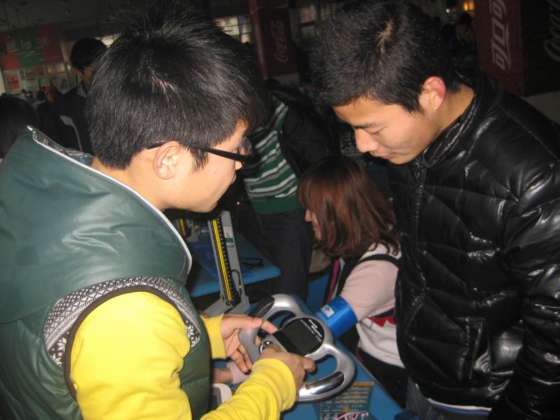 3月3日上午,米乐·M6(中国大陆)官方网站的志愿者们早早在龙山校区安苑食堂门前搭起了咨询台,摆放了血压计等测试仪器,我院学生自主创业开办的弗莱卡校园健身会所也带来了专业的健身器械。活动过程中,广大师生员工纷纷前来咨询有关健身的方法、进行血压测量和检测体脂含量等。我院参与活动的志愿者们耐心细致地进行讲解,认真仔细地为大家进行测量,并根据检测结果告知大家生活中应该注意的事项,得到了大家的广泛欢迎和一致好评。