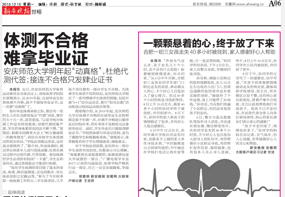 对于学校此项政策,安庆师大一部分学生虽然有些担忧,但都表示可以理解。“体能素质还是很重要的,体测成绩也是大学成绩的一部分”广播电视学专业2017(2)班的马晶晶说,如果学校严格执行这一规定,自己一定会加强锻炼,争取过关。(胡雅丽 新安晚报 安徽网 大皖客户端记者 王吉祥)