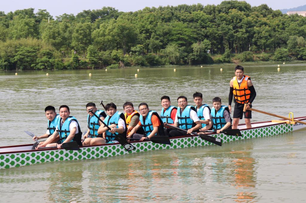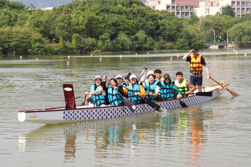 在此次比赛中,师生们分成教工队、研究生队及本科生队进行比拼。参赛选手们在赛前只有进行了强化训练,才能被允许进入正式的龙舟对抗赛。每一条龙舟上都配有一名舵手、一名鼓手以及10至12名划手。随着鼓声敲响,选手们挥动船桨,喊起口号,与队内成员们默契配合、方向一致,使整条龙舟“乘风破浪”、快速前进。浅绿色的龙舟、各色的救生衣与多彩的赛道设置成为校园中一道亮丽的“风景线”。