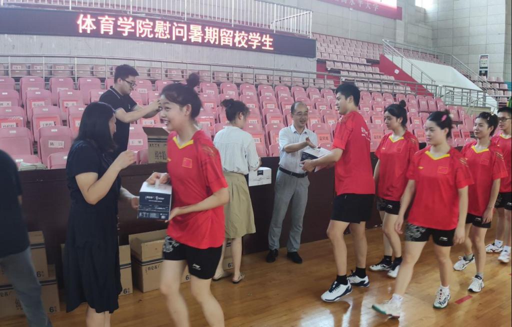 学院领导一行看望了在体育馆备战省运会的手球、乒乓球、健美操等集训师生,并为学生运动员发放牛奶等慰问品。王玮代表学院,向暑期克服困难、辛勤付出的教练员老师表示感谢,向刻苦训练、勇攀高峰的运动员同学表示赞赏。他指出,四年一度的省运动会是层次最高、规模最大、竞争最激烈的省级体育赛事,希望大家将省运会作为专业水平的展示舞台、交流学习的重要契机、大学生涯的宝贵经历,要珍惜机会、不懈努力,充分利用好暑期集训,全身心投入,不断提升竞技能力和水平,力争取得优异成绩,为个人赢得荣誉、为学校和学院展现风采。