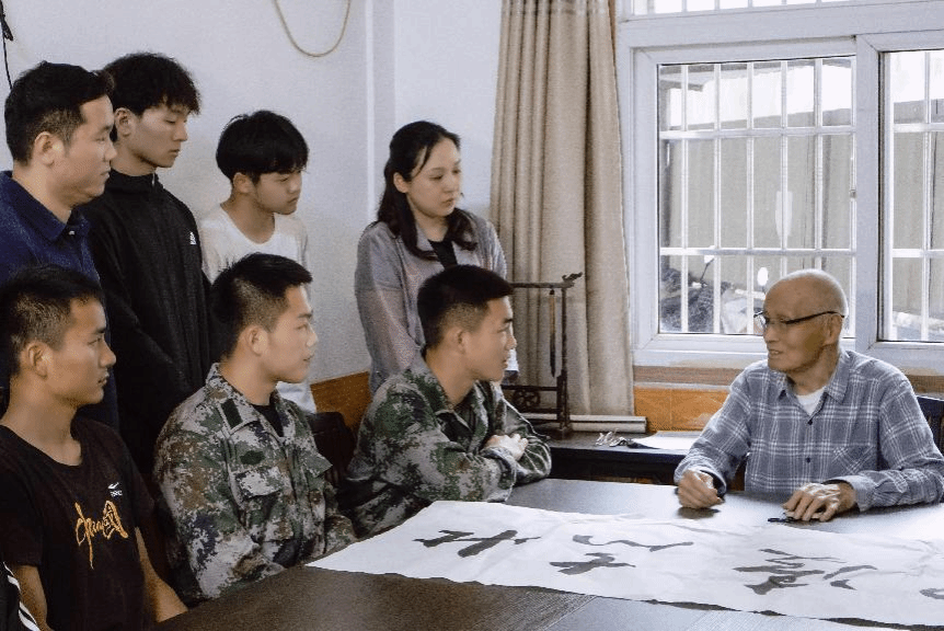 “希望你们都能有宏远的理想,并为之努力奋斗!”93岁的老兵柴瑞轩得知奚文杰等4名同学是刚复学不久的退伍大学生,高兴地铺纸蘸墨、提笔挥毫,创作了一幅题为“壮志凌云”的书法作品,送给同学们。