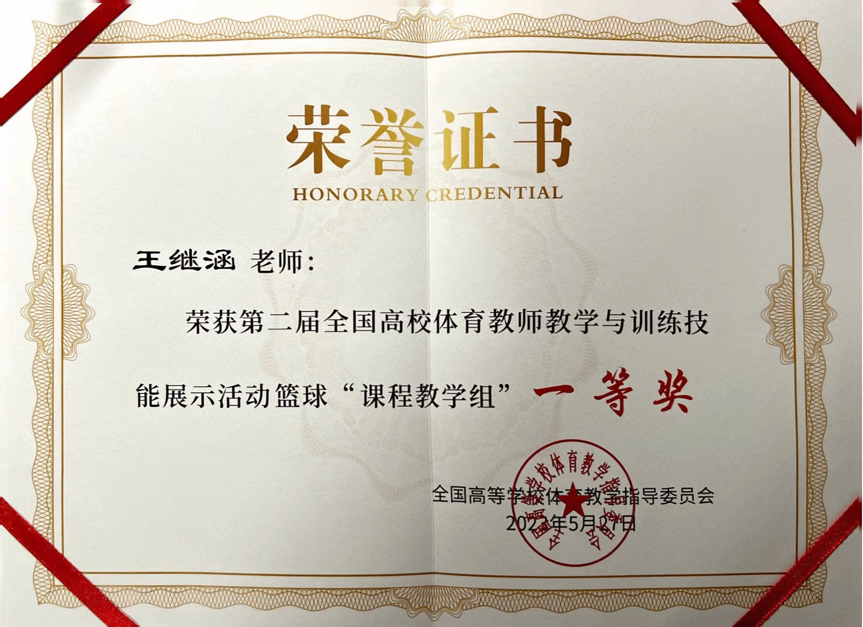 5月26日至27日,由教育部全国高等学校体育教学指导委员会主办的第二届全国高校体育教师教学与训练技能展示活动在浙江财经大学举行,来自全国28个省市的146所高校共计195名选手参加本次展示活动。我校选派米乐·M6(中国大陆)官方网站青年教师王继涵代表安徽省参加比赛,经过线上课堂教学技能展示和线下教学技能现场测试,王继涵老师脱颖而出,斩获“第二届全国高校体育教师教学与训练技能展示活动篮球教学课程组”一等奖。