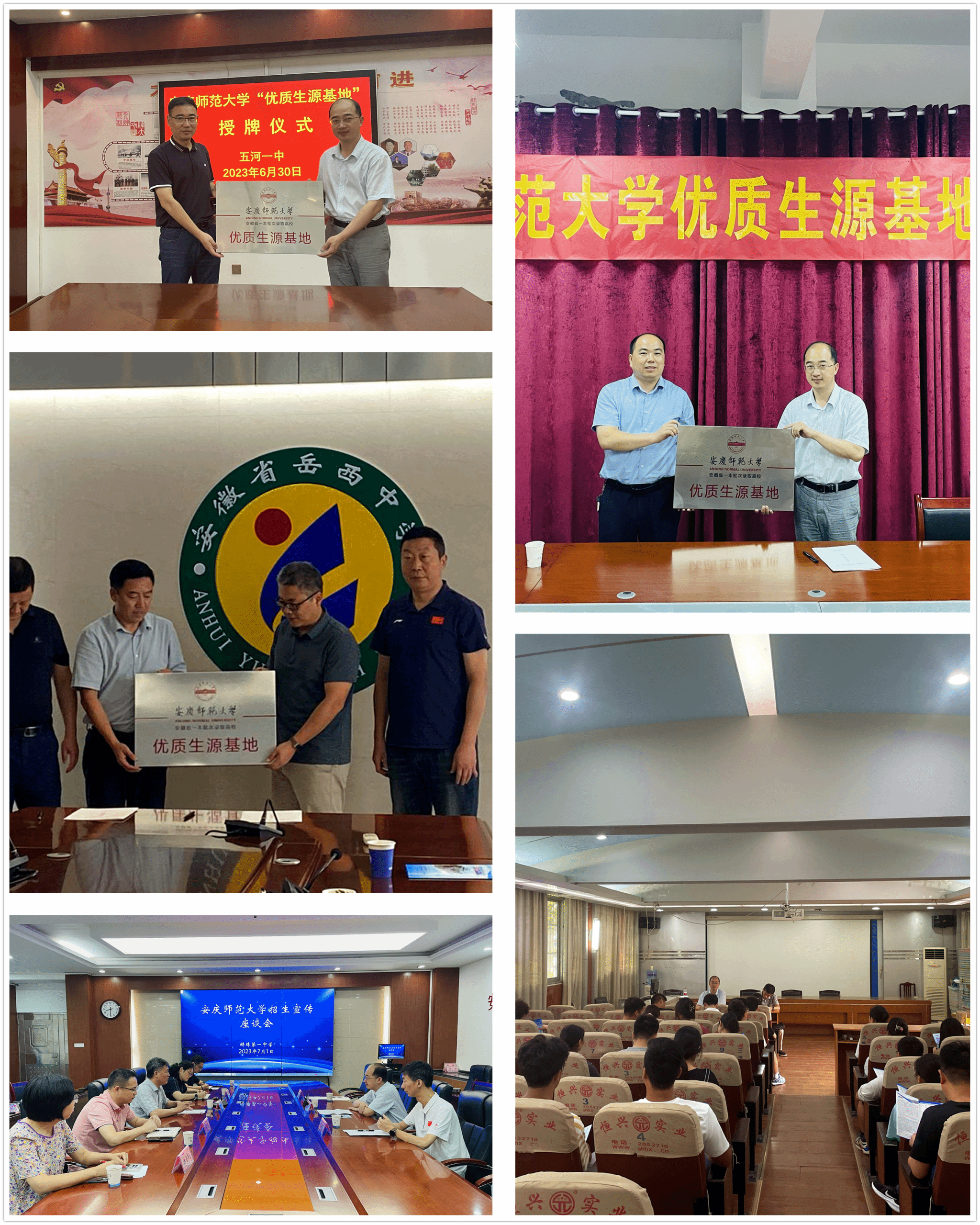 招生宣传组一行分别与五河第一中学、固镇县毛钽厂实验中学、安徽岳西中学签订优质生源基地的合作协议并授牌,回访了安徽省蚌埠第一中学。学院相关负责人分别向4所中学详细介绍了学校办学历史、办学条件、学科建设、专业特色、人才培养等基本情况,解读了今年的招生政策,尤其是介绍了米乐·M6(中国大陆)官方网站办学情况。4所中学相关负责人对学校办学水平和人才培养质量予以高度肯定,对学校招生政策和录取要求有了更深了解,并表示将会组织、动员符合条件的优质生源积极报考,到大学进一步深造发展。招生宣传组在五河第一中学召开了招生宣讲专场,耐心细致地向考生和家长们解答每一个问题,鼓励广大考生积极填报我校。