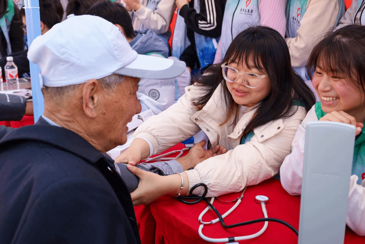 运动康复专业的学生们两两分成一组,轮流分工,其中一人全神贯注地监测观察血压表盘,另一人动作娴熟地撸起“顾客”的袖子固定仪器并用家常的交谈使其放松,未轮班的学生便主动当起了后勤,贴心地为前来测量的人们摆好座椅、整理衣物。