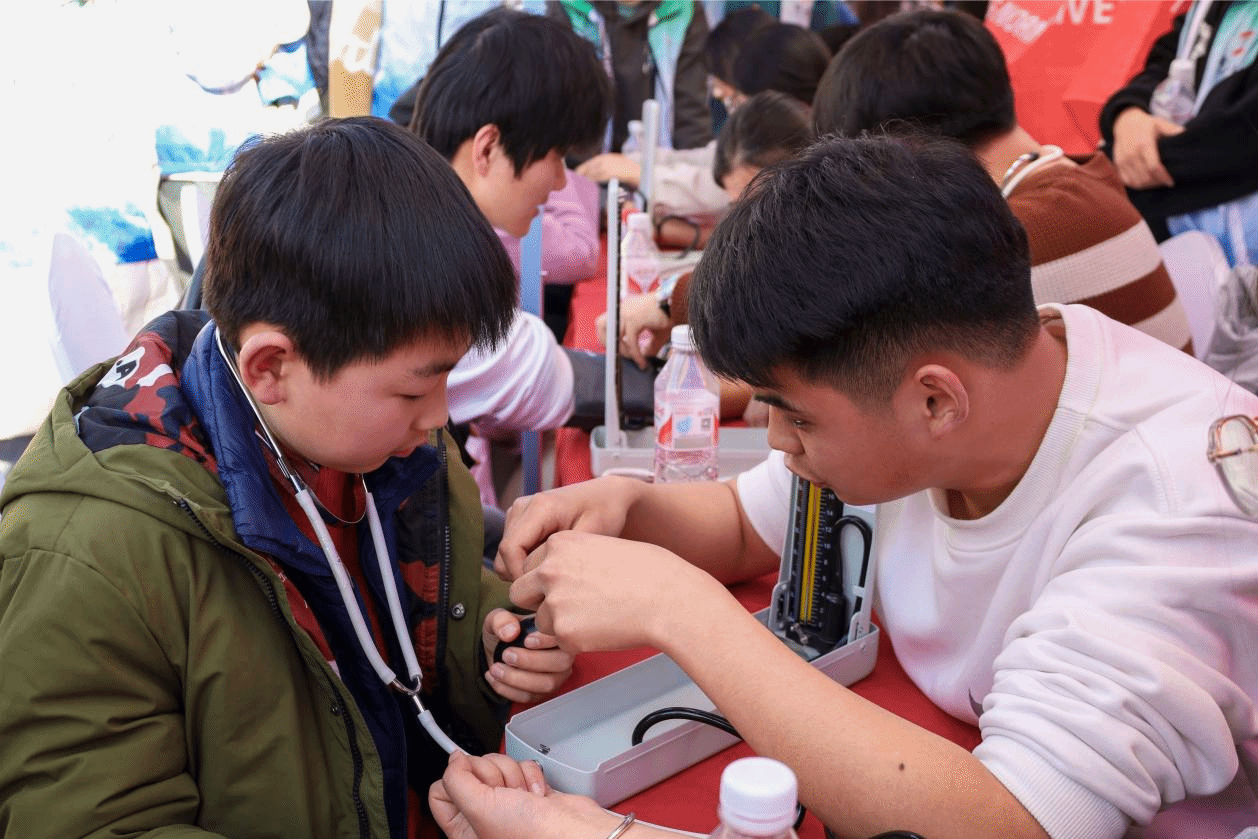 除了为现场市民测量血压,运动康复专业的教师和学生还在闲暇时一起向前来观看的小朋友进行简单的仪器认知教学,手把手地指导其进行血压测量和听诊实操。