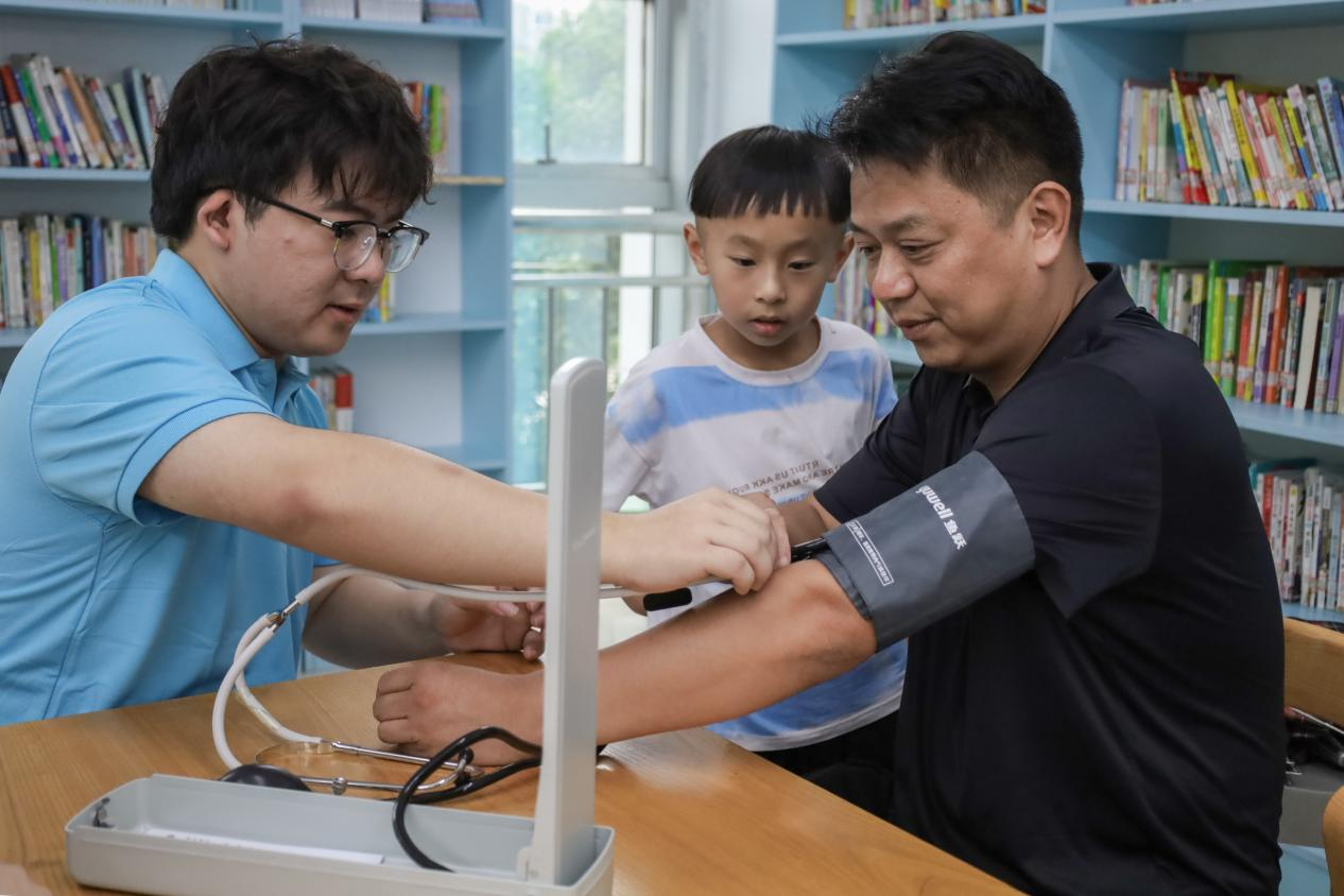 张传强是此次义诊的“主治医师”,此前,他跟随学院教师理论和在实践活动中多次练习过血压仪和筋膜枪的使用方法。“您好,打扰一下,我们是安庆师范大学运动康复专业的学生,我们正在开展义诊活动,您需要测量一下血压吗?”张传强耐心询问陪同孩子阅读的家长,在征求同意后为他们进行血压测量。“我未来想成为一名康复治疗师,此次健康义诊活动不仅积累了我的临床经验,更让我注意到与患者、家属以及其它医疗人员进行有效沟通的重要性。”张传强说。