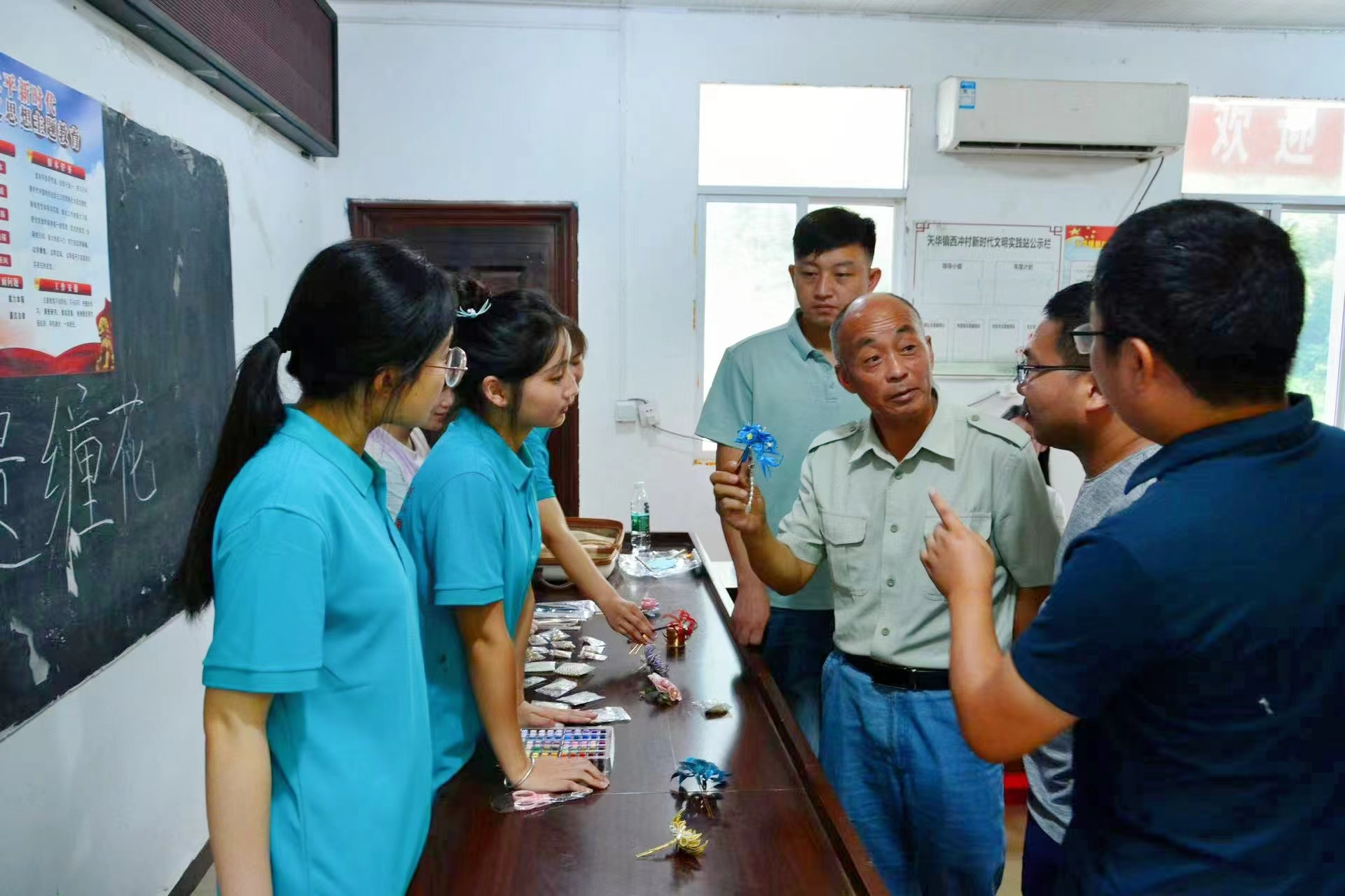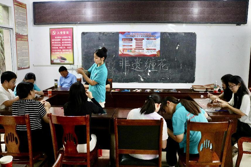 在缠花教学的过程中,村中干部来到制作现场,他们的目光被桌面上整齐陈列的一朵朵栩栩如生的缠花吸引。唐丽妍为他们介绍:“这些都是我亲手制作的缠花成品,有孤傲典雅的秋菊、小巧精致的银杏叶、妖冶艳丽的曼珠沙华。”安庆师范大学于西冲村驻村第一书记张军双手拿起一朵缠花,低头仔细端详。“乡村振兴是经济繁荣和精神充盈的共同富裕。”张军表示,他高度认同实践团的想法,鼓励让非遗项目成为村中特色产业,在文化传承的同时活化增收来源。