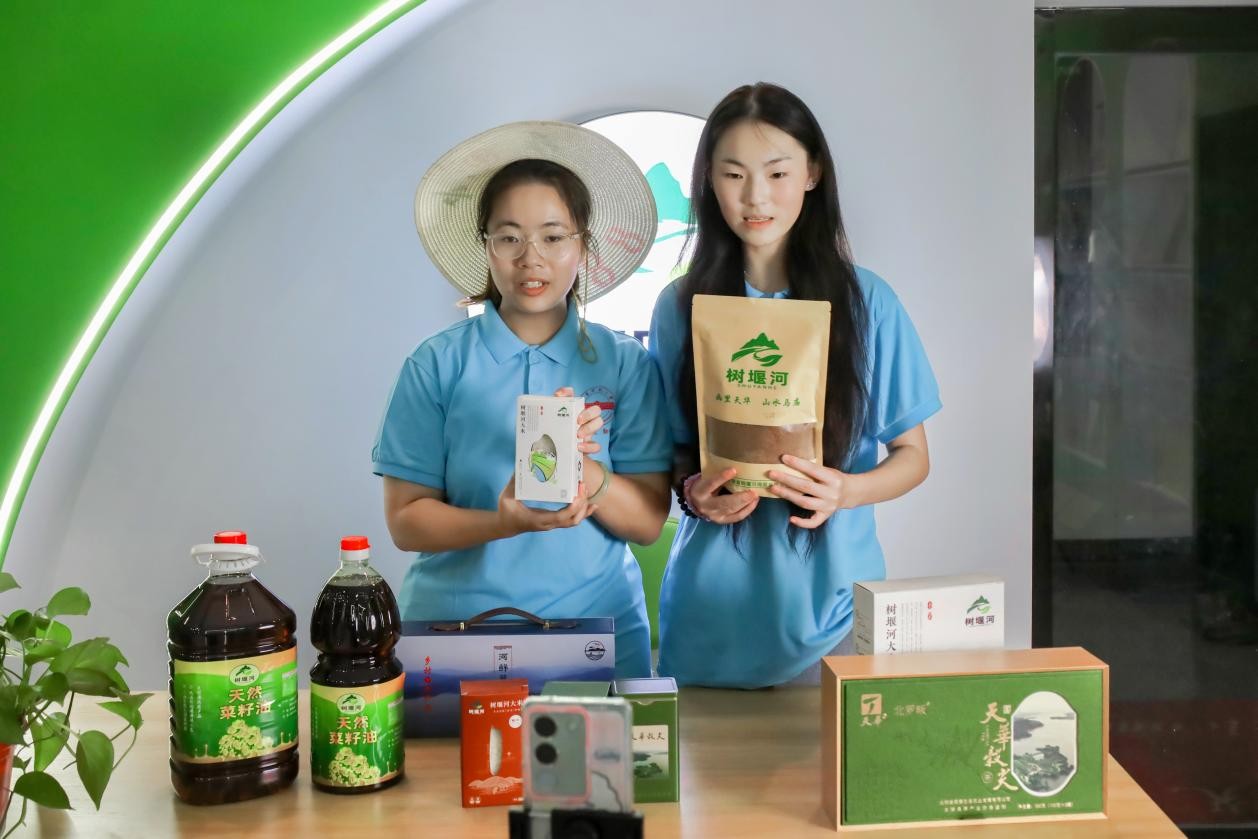 在思维激荡的氛围中,两位书记一合计,提议学生们现场体验一下抖音直播带货。从未接触过直播领域的学生们现场化身带货“主播”。学生们起初面对镜头还有些许紧张,但逐渐被产品魅力和助农热情感染,渐入佳境。“这是树堰河葛根粉,采用高山纯天然野生葛根加工制作。具有解热除烦、生津止渴、醒酒等作用,大家感兴趣的可以后台私信我们哦!”团队成员一个个在屏幕前介绍农产品。