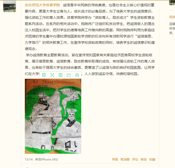 活动各通过悬挂诚信宣传横幅、制作诚信宣传板报、召开诚信宣讲会、组织学生进行诚信宣誓并签字、举办诚信知识竞赛活动、开展诚信教育主题班会、在学院微博上开设诚信教育专栏等举措,在全院范围内形成了人人“讲诚信”“重诚信”“真诚信”的良好风气,有力推动了学院国家助学贷款工作持续健康发展。 (陈守朋)