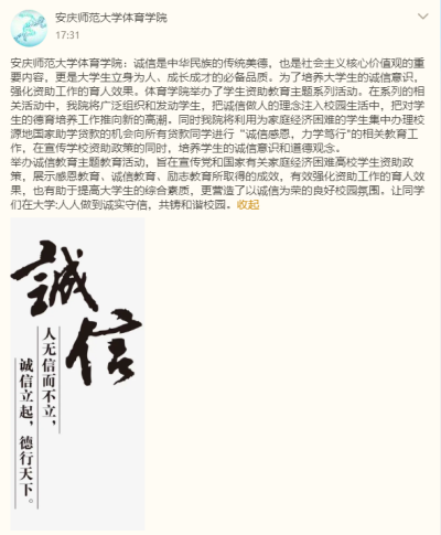此次,资助诚信教育系列活动不仅使广大学生在参与活动的过程中接受了诚信教育,还为学生提供了自我展示和提高能力平台。学院将不断培养大学生的诚信意识,进一步强化资助工作的育人效果。着力引导学生将诚信内化为理想信念,转化为实际行动,形成人人“讲诚信”“重诚信”“真诚信”的良好学风、校风。(撰稿、摄影:储著奇等 审核:高栋梁)