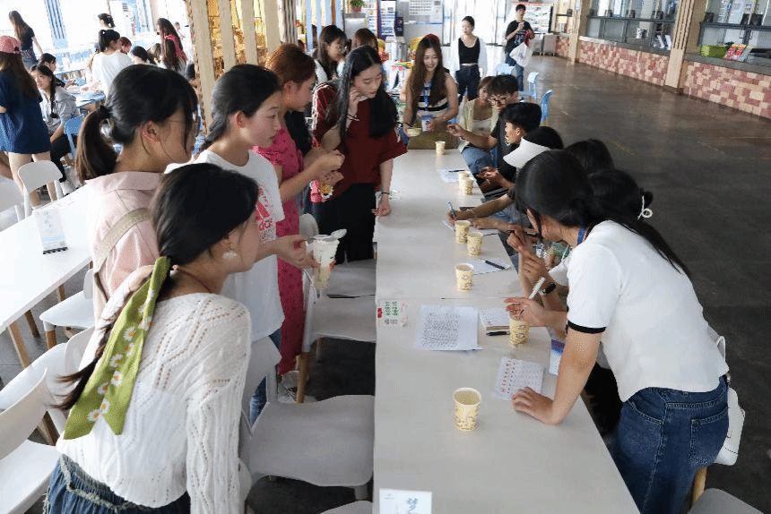 谈及创作过程中遇到的困难时,体育表演专业2022(3)班的徐乐说:“和想象中的不太一样,我们会面临时间不足的情况。但我们在彼此的配合下将这杯‘梵高的星空’完成得很好。”她表示,和朋友一起制作奶茶十分开心。