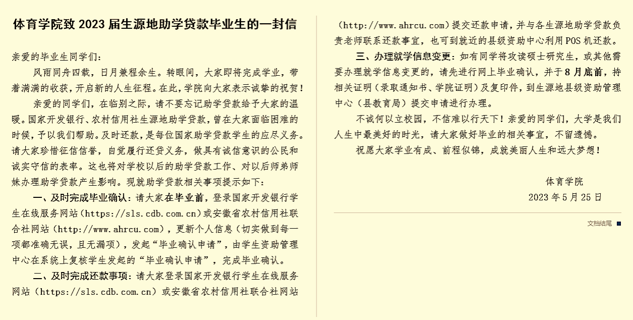 “奋斗是青春最亮丽的底色,行动是青年最有效的磨砺”。作为青年学生,应当有责任、有担当,用智慧和汗水共筑中国梦;作为家庭经济困难的学生,更应该明白,诚信乃立身之本,诚信还贷是对党和国家资助政策的回报,也是检验自身诚信为人的重要指标。为切实做好我院2023届贷款毕业生的贷后管理工作,帮助贷款学生树立诚信还贷意识,学院撰写并发布了《米乐·M6(中国大陆)官方网站致2023 届生源地助学贷款毕业生的一封信》,就毕业确认、贷款还款和办理就学信息变更等事宜进行了详细介绍,将诚信教育贯穿于毕业生文明离校教育中,强化对诚信意识、法律意识和契约精神的宣传。