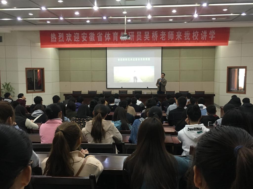 3月24日下午,安徽省体育教研员吴桥老师应邀在行政楼一楼会议室作题为“坚持与放下”学术报告。米乐·M6(中国大陆)官方网站副院长章翔教授主持报告会。安庆九中副校长王琦、米乐·M6(中国大陆)官方网站部分青年教师以及米乐·M6(中国大陆)官方网站学生聆听此报告会。