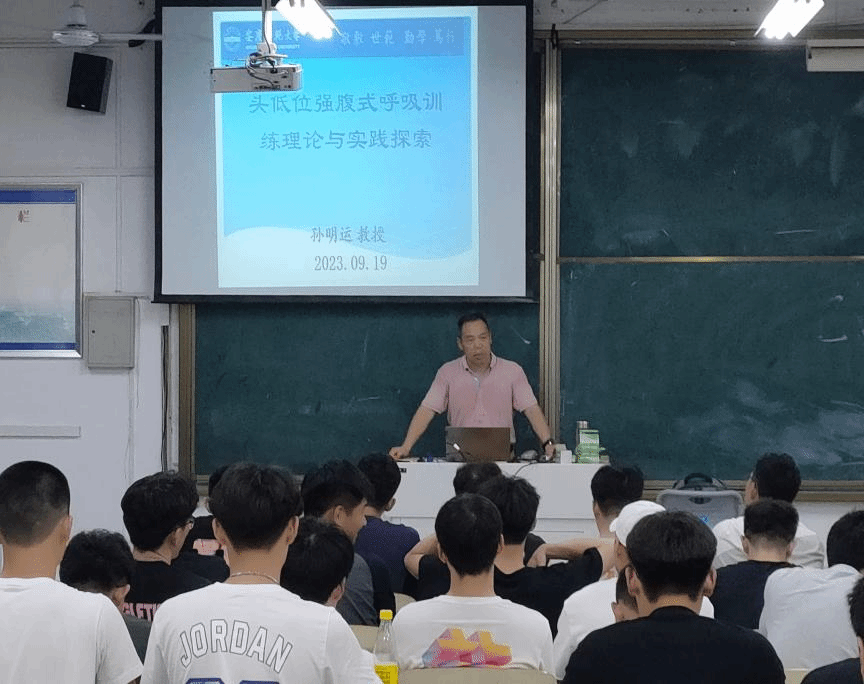 9月19日下午,米乐·M6(中国大陆)官方网站孙明运教授在学校A教学楼作了题为“头低位强腹式呼吸训练理论与实践探索”的学术讲座。体育教育2020级1、2、3班学生聆听了报告。