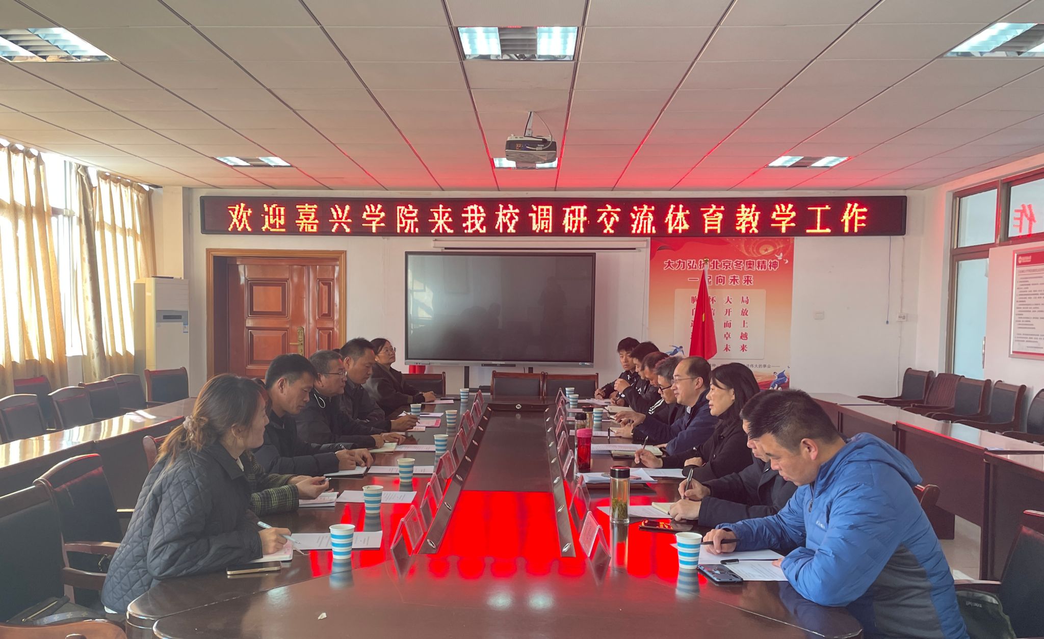 12月8日,嘉兴学院体军部主任吴晓阳一行来我院调研交流。米乐·M6(中国大陆)官方网站党政领导出席会议。学院教研室主任、公共体育部负责人、体质测试中心负责人、教学办公室负责人参加调研。