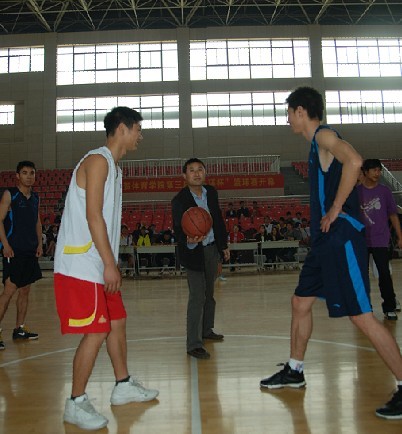 伴随着礼炮声,我院第三届“五环杯”篮球赛的揭幕战—— 07级篮球专选班代表队对阵08级篮球专选班代表队随即精彩上演,副院长周多奇为首场比赛开球。