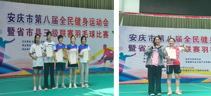 2022年9月19日至22日,安庆市第八届全民健身运动会暨省市县三级联赛羽毛球比赛在安庆市爱玛会球馆成功举办。本次比赛设有团体赛和单项赛,共有来自安庆市县区的35支代表队、405名运动员参加比赛。我校5名运动员在教练员王友亮老师的带领下,顽强拼搏,获得女子单打冠军、女子单打季军和女子团体第二名的好成绩。