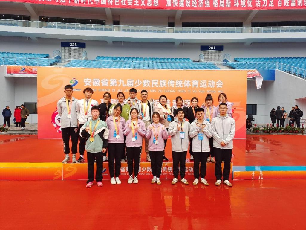 2022年 11月26日至11月30日,由安徽省人民政府主办,安徽省民族事务委员会、省体育局和滁州市人民政府共同承办的第九届少数民族传统体育运动会在滁州市举行。我校36名少数民族运动健儿在许贵泉、张显扬、胡哲纯、潮芳四位教练带领下,参与板鞋竞速、高脚竞速、民族健身操三项比赛,经过5天的激烈角逐,获得1金3银4铜的优异成绩。
