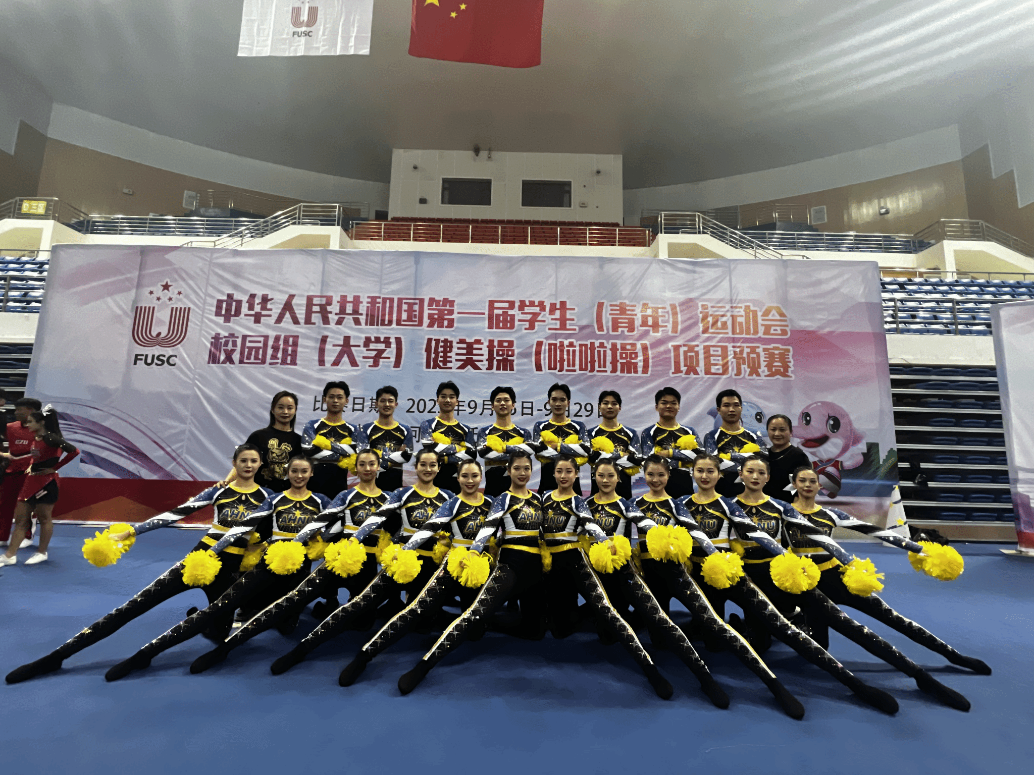 9月23日至30日,由教育部体育卫生与艺术教育司主办的第一届全国学生(青年)运动会大学组啦啦操项目预赛在河北唐山市九江体育中心成功举行。我校3名啦啦操运动员在教练员潮芳老师的指导下,入选安徽省队,代表安徽省出战第一届全国学生(青年)运动会大学组啦啦操项目预赛,全部晋级决赛,为学校赢得了荣誉,为安徽体育增添了光彩。