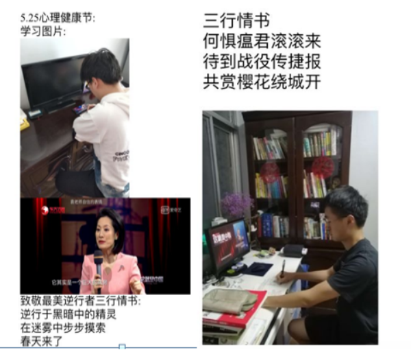 本次线上心理健康节设置“线上学习心理健康知识”“开展心理讲座”“观看战‘疫’纪录片”“‘致最美逆行者’三行情书”等内容活动中,每位学生都积极准备并参与2018级学生王鹏程也总结了自己的感想:“虽然“心理健康节”活动是在线上举行,但是同学们的积极性却丝毫没有受到影响。作为心理服务部部长,我能深深地感受到同学们参与的热情认真的态度!